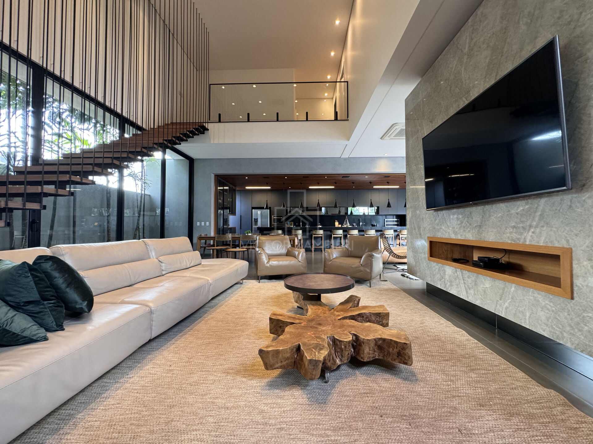 • Pavimento Térreo: Hall de Entrada | Living c/pe direito duplo | Integração de 03 ambientes, sendo Sala TV , Estar e ampla Cozinha Gourmet c/02 pias e um balcão ilha amplo | 02 Lavabos | 01 Suíte | Piscina c/Hidro e Iluminação em Led